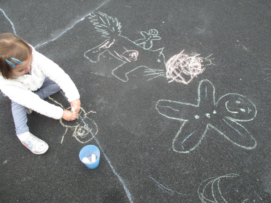 We provide many opportunities to explore mark making both inside and outside of the classroom. Chalk, pens, paint, mud, brushes, sponges, mops, sticks, feathers, pom poms and leaves are all great examples of resources that we use to make marks with.