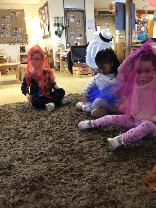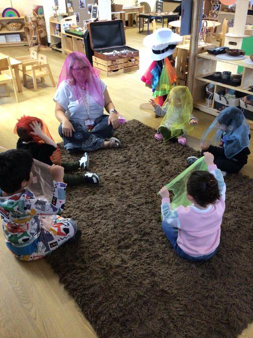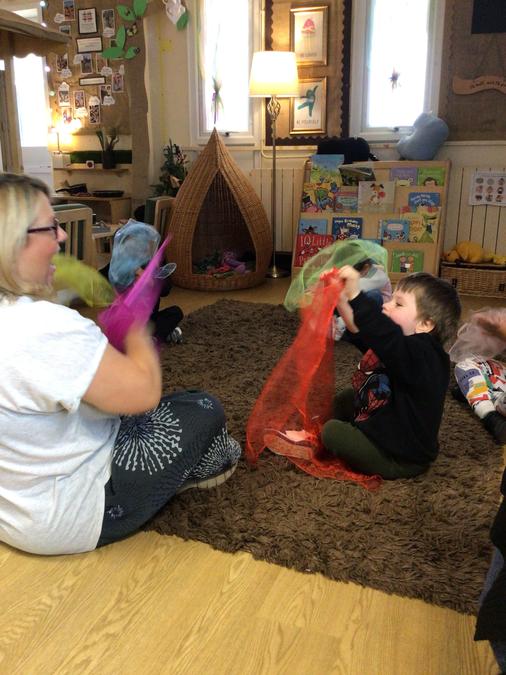 The children have been enjoying singing with scarves. They are following instructions and developing gross motor skills and hand eye coordination. We moved our scarves to the songs ‘10 fat sausages’ and ‘All the fish are swimming’.