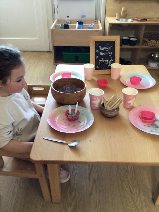 This week the children began learning about birthday's, the children have been sharing their own experiences of family birthdays. We are looking forward to our families sharing some photographs on their child's Tapestry account. We have been making birthday cakes using play dough and loose parts and our role play area has been decorated for a party.