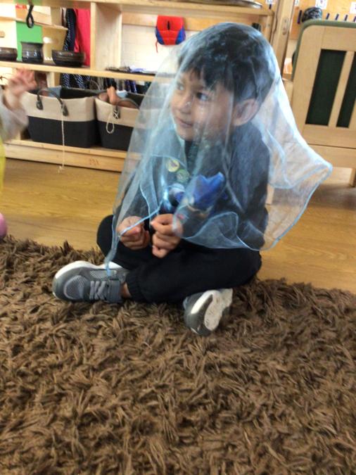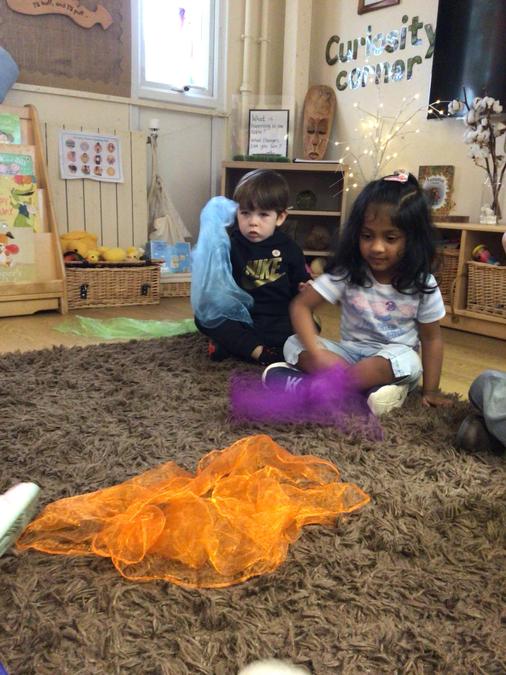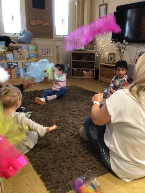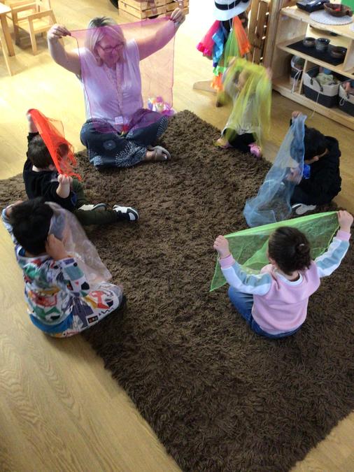The children have been enjoying singing with scarves. They are following instructions and developing gross motor skills and hand eye coordination. We moved our scarves to the songs ‘10 fat sausages’ and ‘All the fish are swimming’.