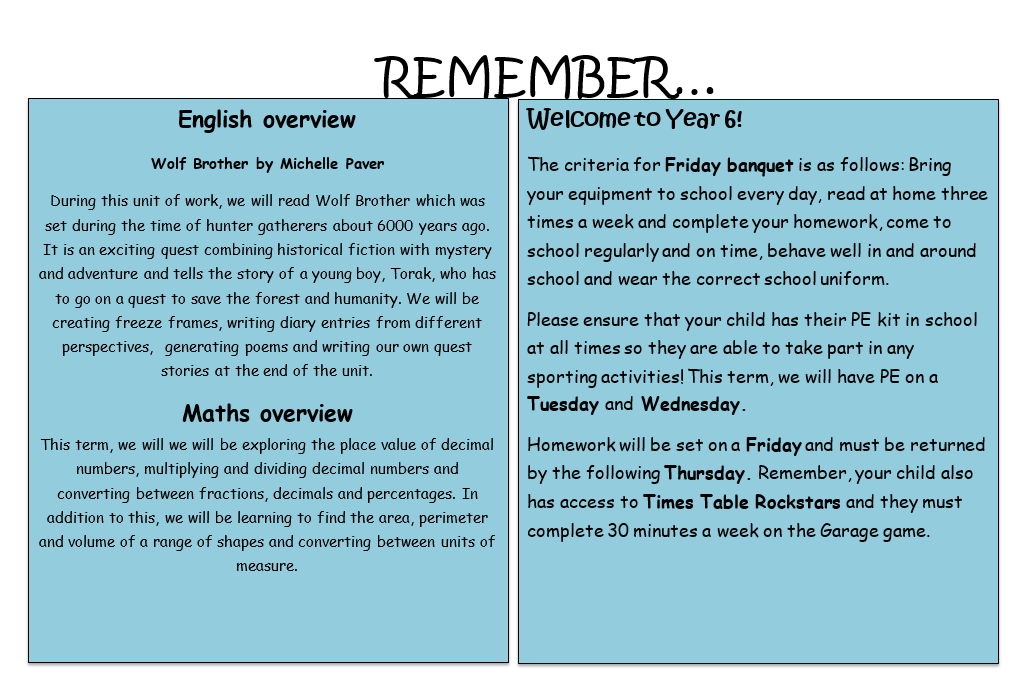 Our homework and reading homework is given out on a Friday, to be returned on the following Thursday.